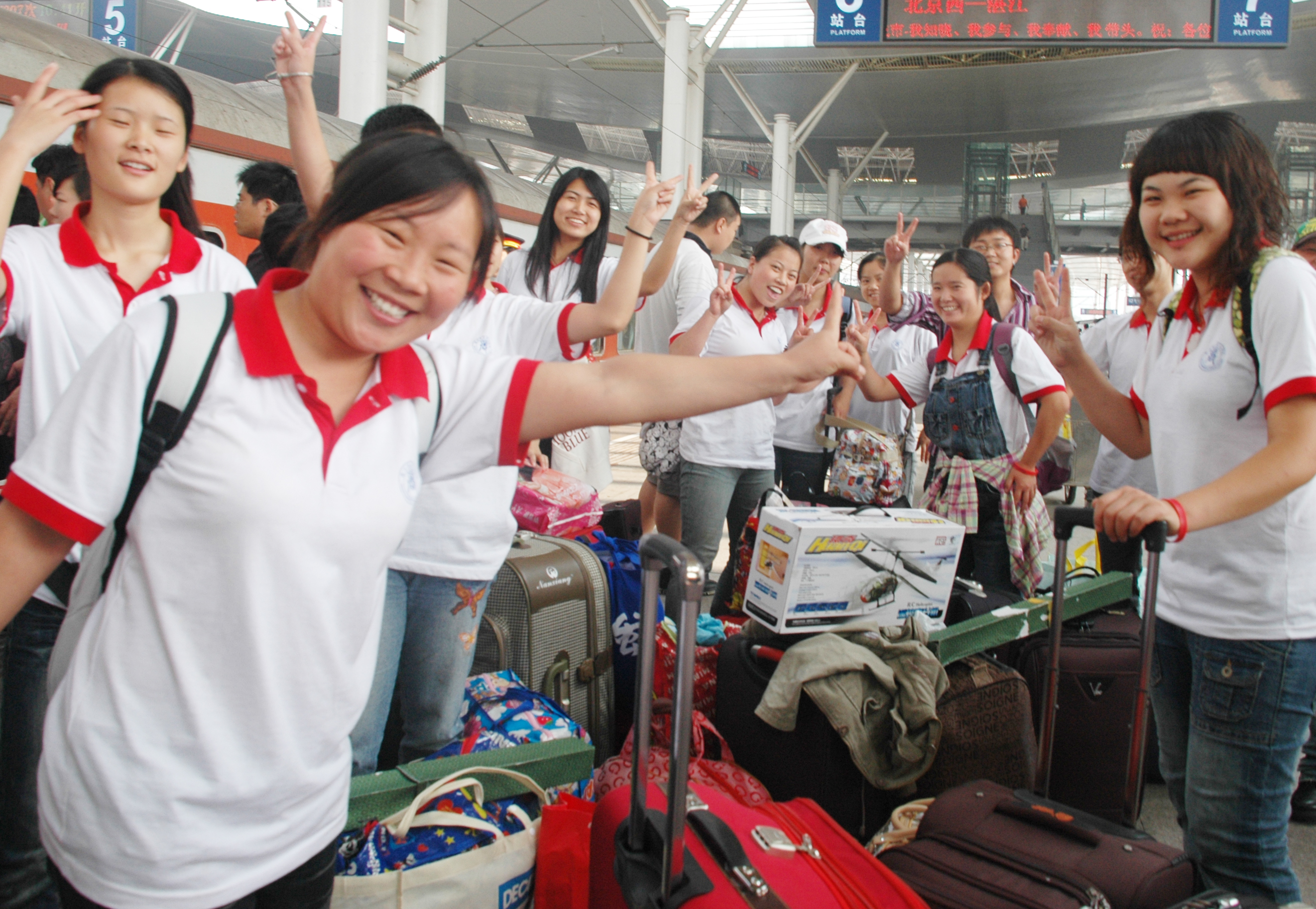 在候车厅里,很多学生的父母都在等待火车的到来,火车的晚点更是让他们感到焦急。当他们看见自己的孩子从火车门口走出来时,心中那块大石头终于落地了。一位提着大包小包的学生看到自己的父母,飞快的跑了过去,扑进父母怀里撒娇。她笑着说:“在北京那么久,最想念的还是自己的家,自己的父母,还有妈妈弄的菜!”她的父母也是亲昵的牵着她,“她去北京那么久,我天天在家里面想她,真怕她在那边不习惯。但是一想到她是为北京奥运服务,我心里就为她感到骄傲,再苦再累也希望她坚持下去!”他们的脸上始终洋溢着骄傲的表情。
