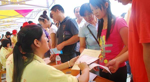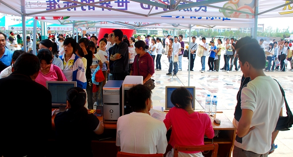 致远广场是此次迎接新生的“中心地带”,五彩的帐篷顺着两边排开,各招新接待点里人头攒动,一片忙碌的景象。招生就业处及各院系均在此设立了新生接待站。