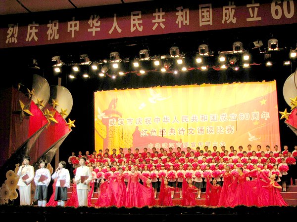 当天下午14时30分,由武汉市各区推荐的17个优秀节目齐聚解放军通讯指挥学院大礼堂,我校商贸学院代表武汉经济开发区参加了比赛。经过三个多小时的角逐,我校124名学生表演的诵读《放声歌唱》,以饱满的激情,出色的发挥,受到大赛评委的好评,喜获金奖。