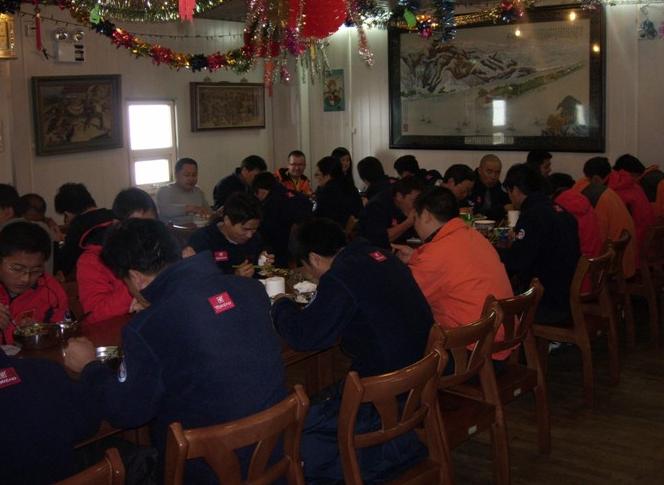经过了1年多南极越冬的中山站,食物已经很单调了。除了能够冷冻储藏的肉食品,再无其他原料了,蔬菜没有、鸡蛋没有、姜蒜没有。由于当时还处在卸货阶段,而且天气不好,生活物资都没有卸下来。我们根据现有的原料,做了豆腐泡烧肉、腰果虾仁、脱水青菜和元子汤。元子是脱水青菜和鱼肉为原料做的,都是自己合的,因为没有生粉,只能用面粉代替,弄的相当麻烦。
