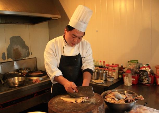 拿货是个大问题。因为原料需求量大,当厨师还要当搬运工每天从食品库拿货。食品库离厨房虽只100多米,但从雪地走过去就要花很长的时间,又很不好走,厚厚的积雪里深一脚浅一脚很艰难。