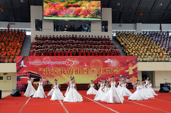 我校隆重举行庆祝建国六十周年“我爱我的祖国”系列教育活动,图为我校庆祝建国六十周年大会暨红歌会,两千余名师生欢聚一堂,纵情歌唱,祝福祖国。