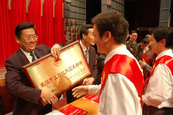 校团委被评为武汉红旗团委标兵,图为省委副书记、市委书记杨松同志为我校团委颁奖。