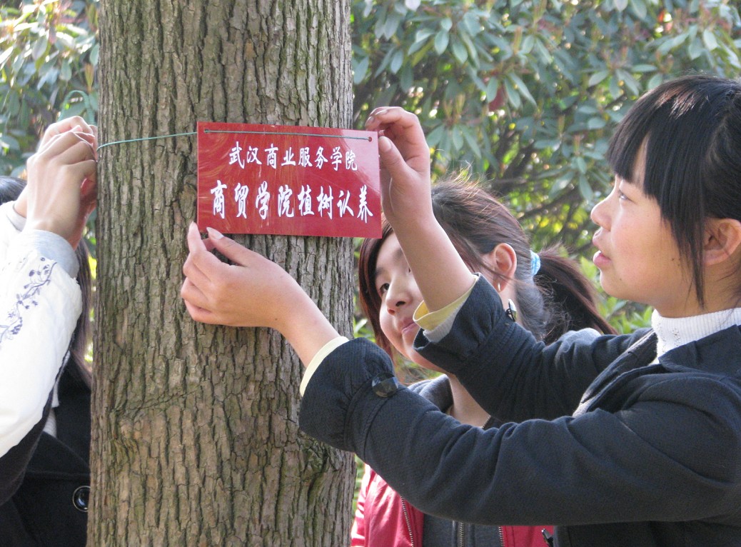 3月11日 ,我校商贸学院50多名学生来到全国文明示范社区武汉市江岸区百步亭社区,义务认养了五棵高大的樟树。同学们将定期到社区对认养的树木进行浇水、施肥、除草等维护工作。
