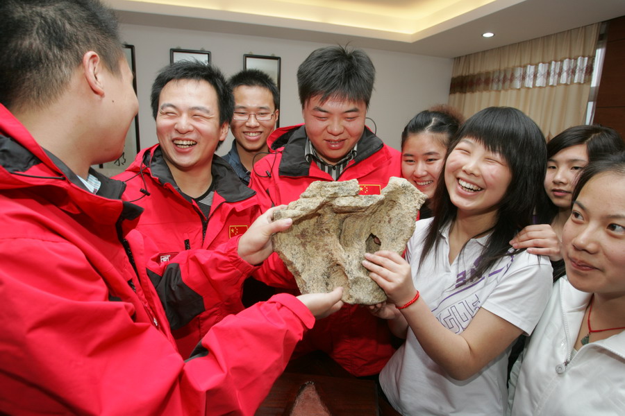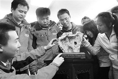 昨日,三位服务中国第26次南极科考队队员的武汉商业服务学院学生将一块采自中山站的南极石赠送给母校。这块南极石高40厘米,重达20公斤,采自南极中山站旁的一个湖边。图为三位“南极厨师”向学弟学妹们介绍南极石的特征。(记者张�� 摄影报道)