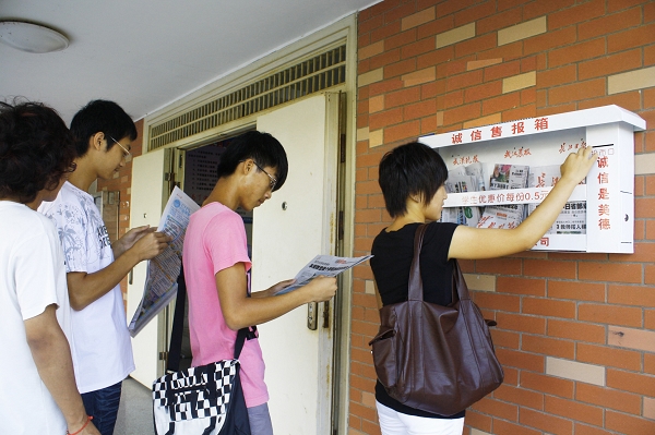 近日,武汉商业服务学院学生公寓的一些门栋门口,出现了15个无人售报的“诚信报箱”,学子们不出公寓,将零钱投到报箱旁的投币口,就能看到当天的长江日报、武汉晚报和武汉晨报。