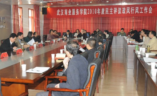 会上,宣布了《我校2010年度民主评议政风行风实施方案》、《武汉商业服务学院开展党员干部腐败预警防控工作实施方案》。我校民主评议政风行风紧紧围绕学院中心工作,与政风行风建设的重点任务相结合,与切实解决影响教育科学发展的突出问题相结合,包括促进发展、规范行为、公开透明、服务与效率、反腐倡廉建设、问题整改等七个方面的内容。