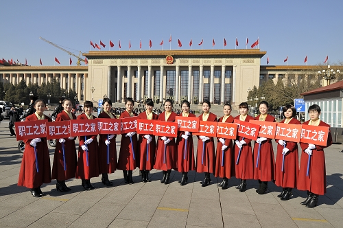 一袭鲜红的宽边长大衣,衬着粉黄的围巾、黑皮靴,北京天安门前,青春靓丽的“两会” 礼仪员成了特殊的风景。在这些礼仪员中,有一些是来自我校旅游系大二的实习生。