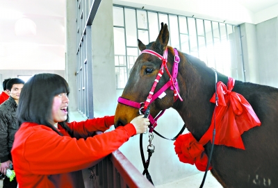 学生在马厩与骏马亲密接触