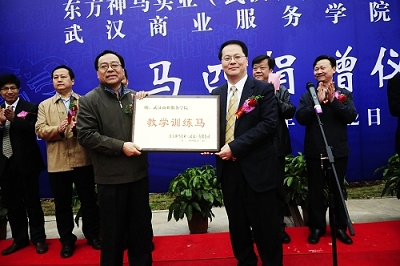 校内建设练马场和引进马匹,在全国高校为首次。我校举行了隆重的捐赠仪式。武汉市体育局局长王沈顺、东方神马集团总裁胡越高、我校院长张元树参加了仪式,副院长王京章致辞并向东方神马公司回赠牌匾。副院长王辉华主持仪式。