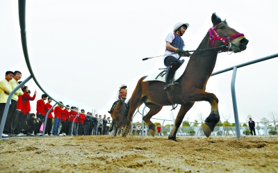 捐赠仪式结束后,,骑师班的学生骑师们骑着马,在练马场上一展骑术。这个练马场投资60余万元兴建,占地7.9公顷,可为学生提供养马、驯马、遛马等基础训练,而骑乘等专业训练仍在东方马城完成。