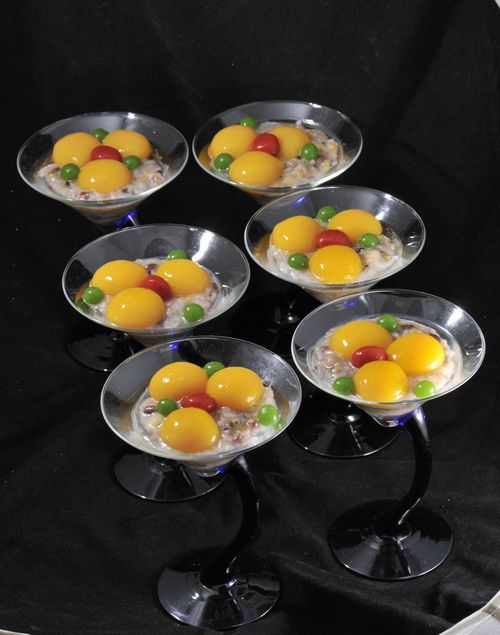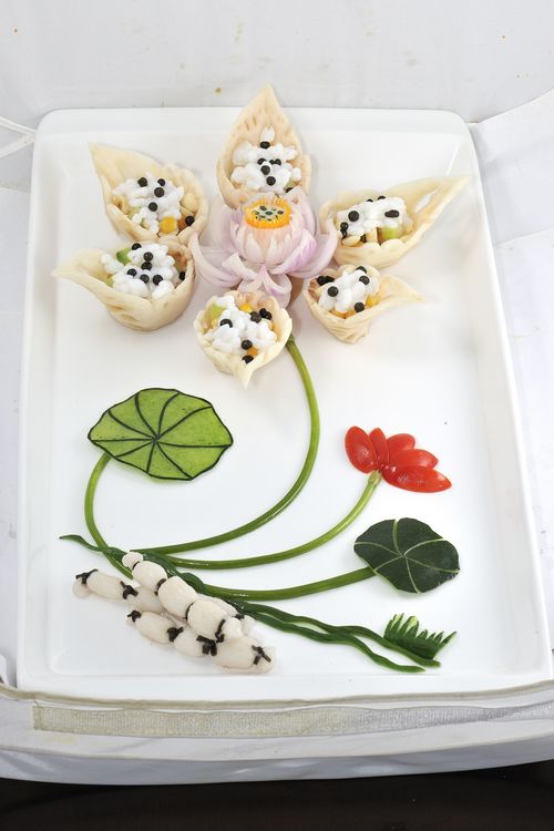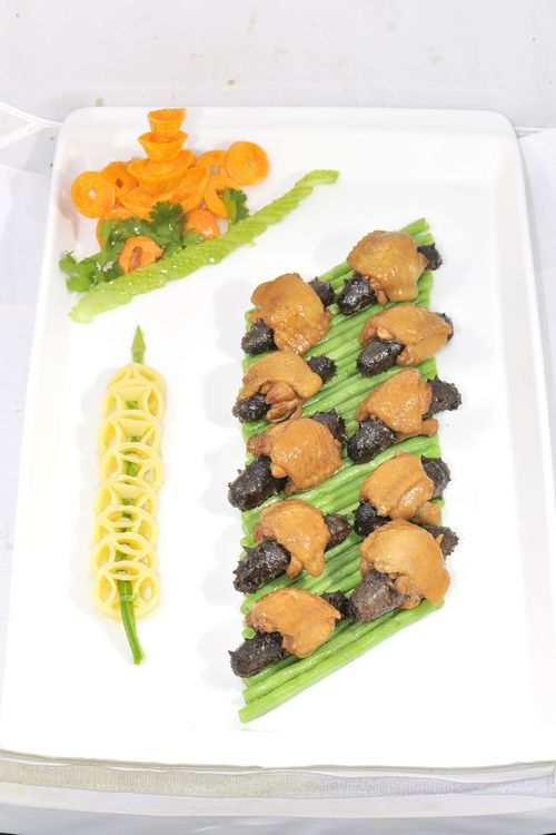 我校“荆风楚韵”筵席,由5名大一、大二的学生完成。用了鱼、牛肉、虾、火腿、杏鲍菇、黄瓜、樱桃番茄等44种原料,用时4个小时,包括8道热菜、6道凉菜、2道面点。以花中四君子“梅兰竹菊”以及莲荷、水仙为题材的凉菜,组成“寒香”、“兰芳”、“高节”、“霜彩”、“洁雅”、“仙寿”不同的图案,造型逼真,意境高雅。热菜琴台珊瑚鳜花鱼、游龙戏凤闯天下、沔阳扣珍珠鳝鱼以及面点长阳土家腰鼓酥精致灵巧,具有浓郁的楚乡风格,获得评委的高分。