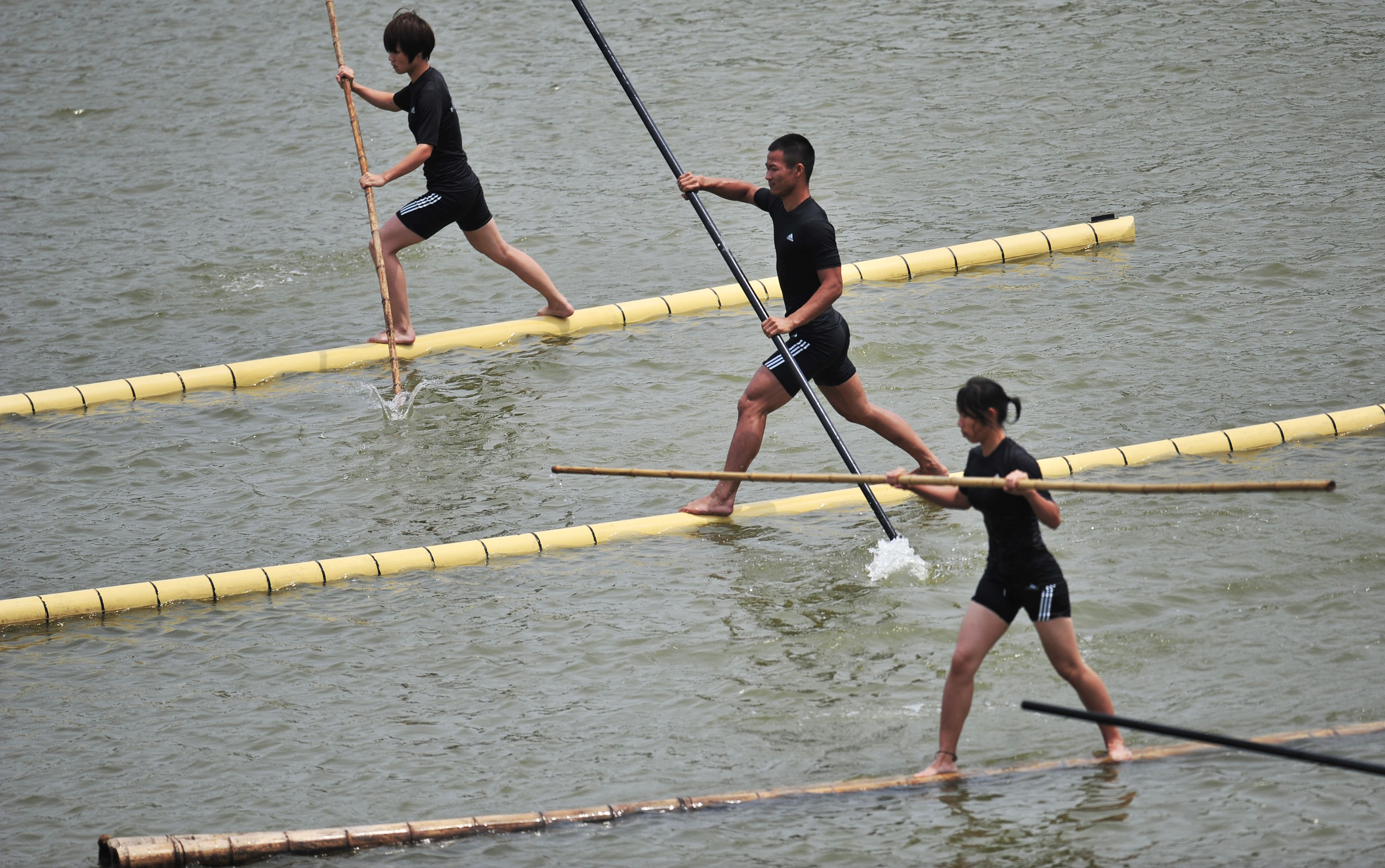 “第一次看见时心想,怎么能站得住呢?”整整半个月,队员张威才在竹漂上站稳,“刚开始时走到中间都困难,根本站不住,直往水里掉。竹漂是糙面儿的,一蹭就掉一大块皮。”他向记者亮出腿上的片片伤疤,疤痕颜色深浅不一,显然不是“一日之寒”。台上一分钟,台下十年功。翩若惊鸿的水上表演是台下苦不堪言的训练成就的。