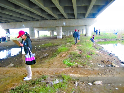 南湾湖大桥桥西水域几成死水。让志愿者们担心的是,这些桥下残留的土足足和桥差不多宽,厚厚的黄土几乎将桥东西两侧的水域隔断。桥西部分被围成了一个几亩的水域。志愿者们沿该水域岸边行走,发现这里竟然已经被围成了“死水”,几乎无法和桥东的后官湖主水域联通。