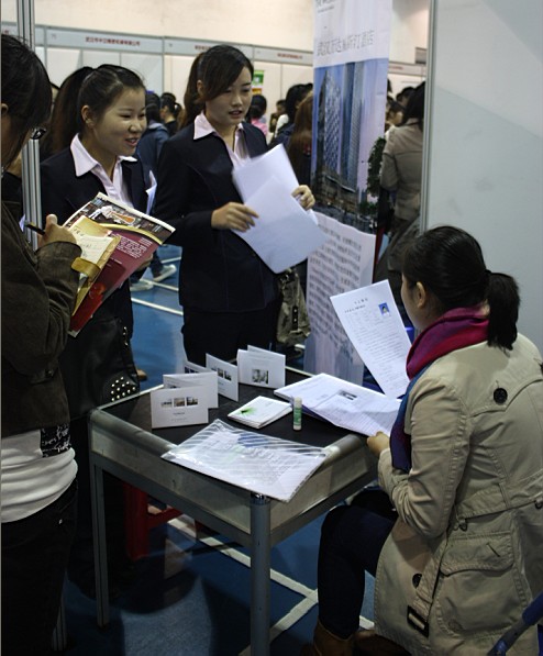 今年招聘会最豪华阵容非武汉诗邦房地产代理公司莫属。10名招聘官一身色彩鲜艳的橙黄色职业装赚足了眼球。这10名招聘官中有三位是我校已毕业的学生,刚进企业不久就凭借自身的努力升职,最高的已做到销售经理的职位。据负责人介绍,今年给出的月薪比去年高出300-400元,学生最关心的“五险一金”和岗前培训问题也会在入职后兑现承诺。