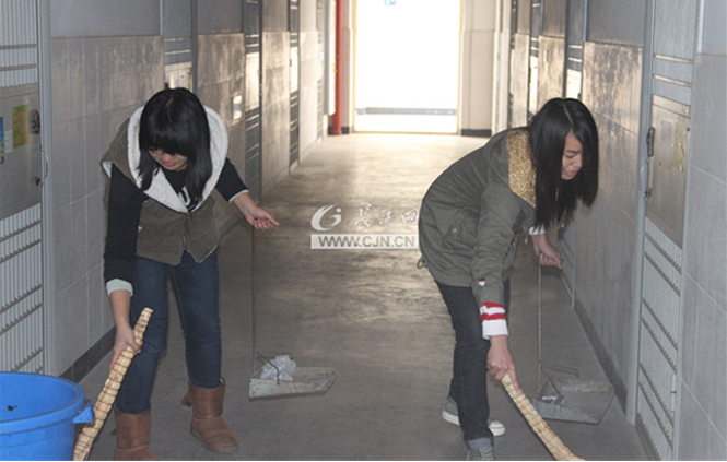 这些同学都是自愿报名来做特殊的“义工”的。下午2点,他们就早早集中在学校的观湖苑学生宿舍下,与清洁阿姨一起对学校北区的6栋宿舍楼进行打扫。