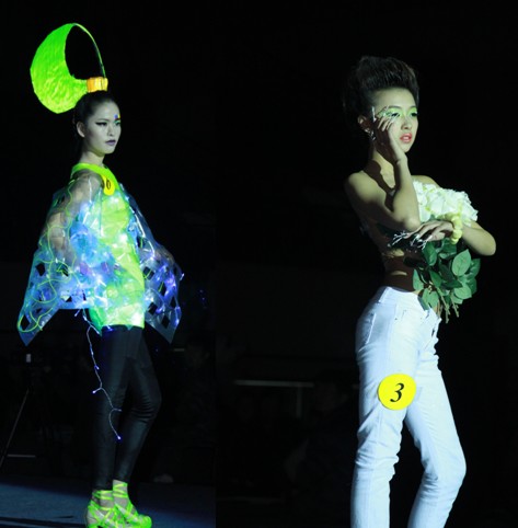 颗粒大小的果味糖衣镶进白色小礼服上,单色调的礼服在五颜六色的糖纸的点缀下,这套服装大胆的设计者是该校2010级形象设计专业韦金玲,将100多颗糖果衣缝到服装表面,韦金玲花了近一个月的时间。在网上买了近50元的糖果、精致发夹,再一针针缝上去。一做就是一个月。每天盯着小糖果,韦金玲表示满眼都是糖果,让人不禁回忆起童年与小伙伴吃糖果的趣事。她自己上台做模特,展示自己的“杰作”,面对同学们的欢呼,很有成就感。