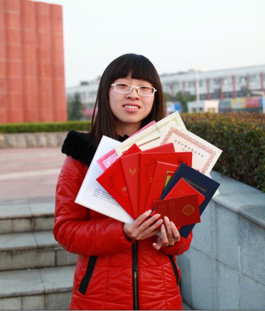 两年的大学时间里,她相继考下了会计从业资格证、证券从业一级资格证、助理理财规划师、数字化高级平面师“资格等十几个证书,被称为”证霸”。十余个证书中,她拿到包括沙盘模拟和社会实践在内的6、7个证书,其中专业类证书除了英语三级和计算机一级等证书外,大部分为自愿考取,而非专业要求。在商贸学院教研室柯美胜老师的指导下,她在《管理学家》期刊上发表了一篇关于“开展ERP沙盘模拟大赛提高职业能力”的论文。