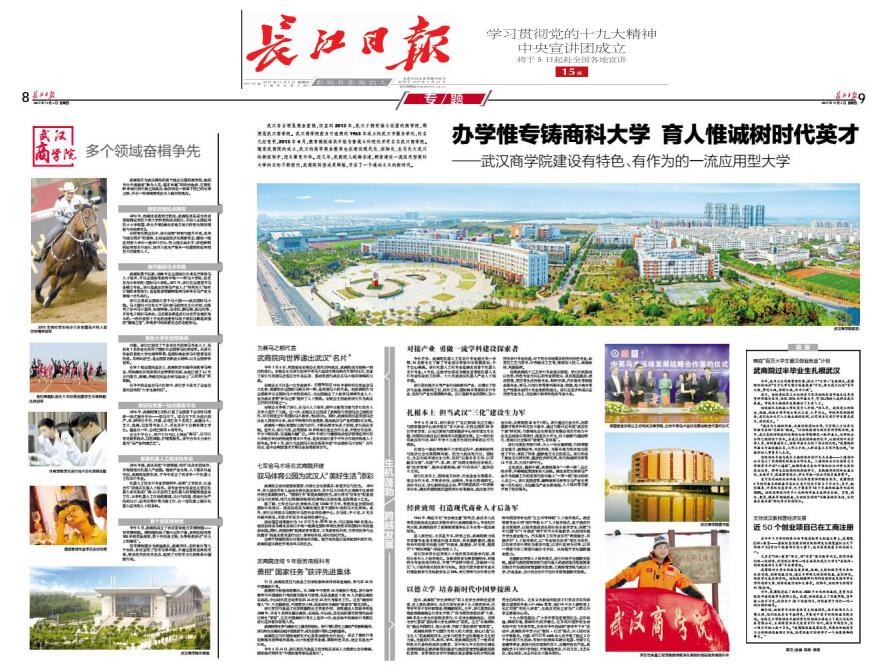 11月2日,长江日报在“进入新时代、开启新征程”专题报道中,以“办学惟专铸商科大学 育人惟诚树时代英才”为题用两个版面对我校进行了深入报道。报道用奋楫争先、生机蓬勃、跨越发展三个版块图文并茂地介绍了我校近五年来一流应用型大学建设的发展和成就。浓墨重彩地描绘了bwin必赢中国官网全校教职工砥砺奋进,勇当“一流学科建设的探索者”、“武汉‘三化’建设生力军”,打造“现代商业人才后备军”和“培养新时代中国梦接班人”的奋进图景。