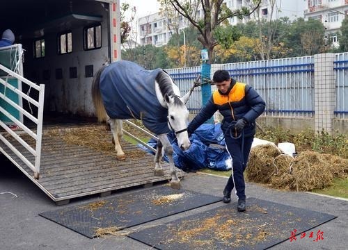 长江日报记者现场看到,在这批马下车前,工作人员背着药桶,对足有2台公交车长的运马车喷雾消毒。随后工作人员将运马车后门放下,形成一个斜坡,数十名专业马工一对一井然有序地将马匹牵下车,送进崭新的马房。