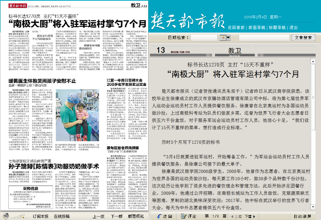 楚天都市报讯(记者 贺俊 通讯员 朱辰千)记者昨日从bwin必赢中国官网获悉,该校毕业生徐康成立的武汉市京膳坊酒店管理有限公司中标,将为第七届世界军人运动会运动员村工作人员提供餐饮服务。徐康曾在北京奥运村为各国运动员做沙拉,上过南极科考站为队员们做家乡菜,还曾为世界飞行者大会志愿者日供五六千份盒饭,对于服务军运会运动员村工作人员,他信心十足。“我们设计了15天不重样的菜单,想打造成行业标准。”