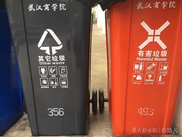 记者看到,这些校园“新访客”指向很明确。在放置有害垃圾的红色垃圾桶桶身上,废电池、电子产品、过期药品、废旧灯管等物品不仅有形象图标进行标注,还辅之以文字说明。在可回收垃圾的蓝色垃圾桶上,牛奶盒、可乐罐则是它的“对口”物品,绿色垃圾桶回收餐厨垃圾,类似纺织品、破旧陶瓷等其他垃圾则放置在灰色垃圾桶里。
