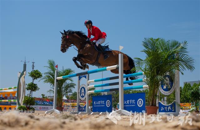 5月11日,北京队选手巴根驾驭赛马在进行1.5米级别个人赛。
