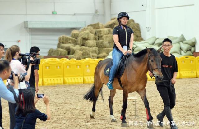 在观看了马术场上骑手在雨中的马术表演后,釆访者们还在室内马场由工作人员保护,骑上马背徐行一圈,体验了一把骑手的感觉,女记者们尤为兴奋。
