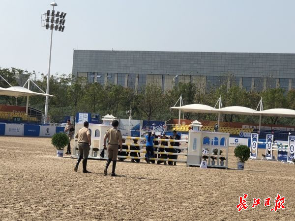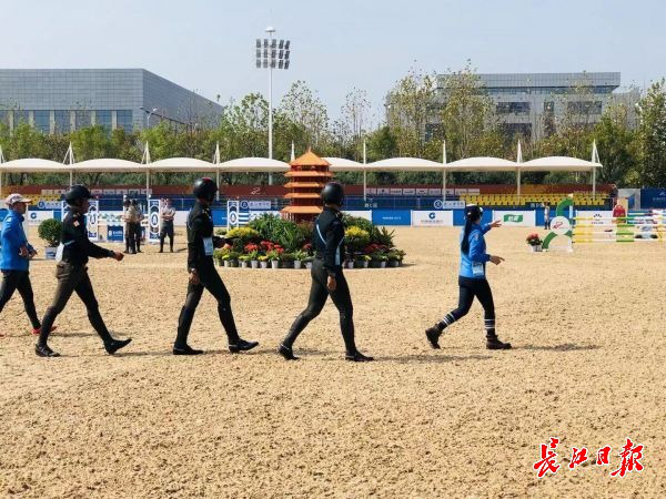 在马术障碍赛场地,参赛队在抽签获取马匹后,不少运动员选择步行进入场地,体验场地设置,用“步行”方式多次丈量连跳障碍之间距离,为19日上场做准备。