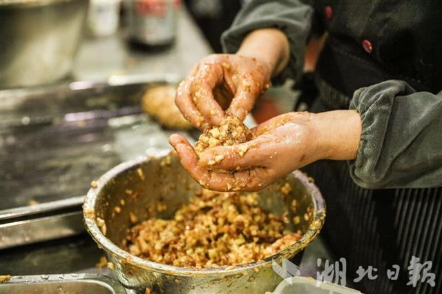 拌好的馅料在他手上转得飞快,经过数次的摔打和揉捏,一个成型的狮子头被摆入不锈钢盘中,等待下一步的制作。“不一样,真的不一样。”
