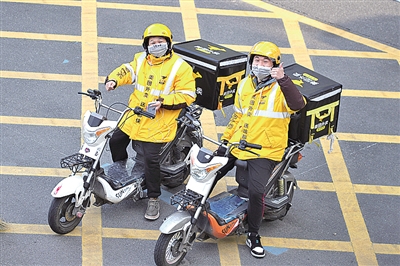 3月10日,武汉市洪山区洪山体育馆外,两位外卖小哥在这里等待取货的客户。本报武汉一线报道组记者 季春红摄/光明图片