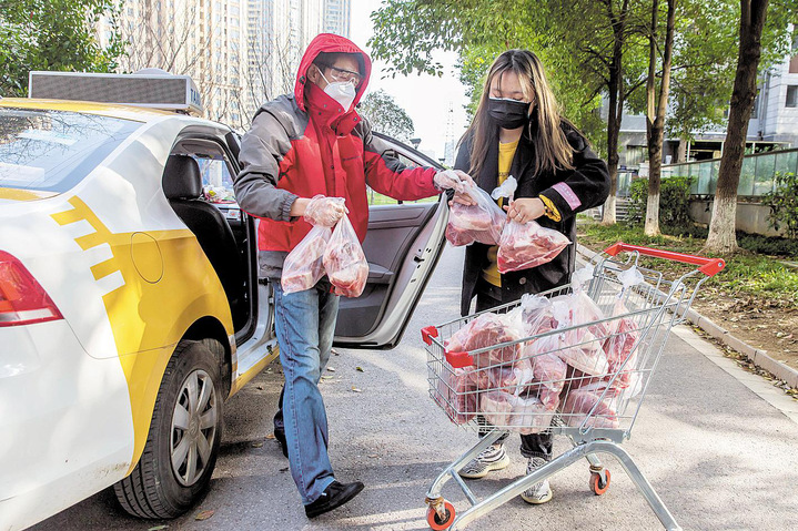 3月10日下午,湖北经济学院法商学院学生、中共预备党员、00后志愿者赵蓓琳(右),正把社区团购回来的猪肉分送到各门栋居民。疫情期间,她担任融侨华府社区团购楼栋团长,悉心为社区居民服务。(湖北日报全媒记者 梅涛 通讯员 谭华灵 摄)