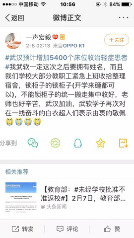 此外,记者还得知,2月7日下午,武汉仪表电子学校(中职学校)接到武汉市新型肺炎防控指挥部的征用通知,学校寝室将被作为疫情防控集中隔离场所。该校立即组织党员教师赶赴学校,清理学生寝室。50余名老师第一时间赶到学校,一直工作到2月8日凌晨两点多,连夜整理出近1500余间学生宿舍。今日上午9:30该校开始搬运寝室所需要的各类生活物资。