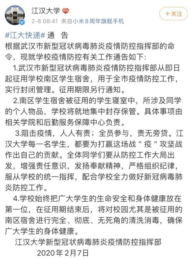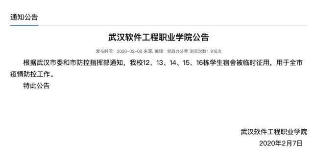 目前,多所被征用学校已发布公告:部分学生宿舍被临时征用,用于武汉市疫情防控工作。