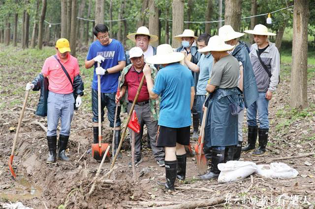 在防汛现场的巡险中,一处渗透引起了队员们的注意。在确定了出现渗透漏水的情况后,队员们马上上报情况,在专人的指导下妥善处理,并插上小红旗做好标记。“我们要把这些隐患提前都排查出来,如果情况严重,那么就需要专家来现场解决了。”张奔说。作为突击队的负责人,张奔前脚刚结束了自己在社区的疫情防控工作,如今又站在防汛工作现场。而像张奔这样的情况,在突击队员中并不少见。第一小组组长童曙在疫情期间下沉到新洲区从事疫情防控工作,现在和队员们一起守卫着每一寸堤坝安全。为了做到全覆盖,童曙带领队员们反复用手破开草丛、按压土壤,查找内坡有无浸漏、管涌等危情,不放过一丝一毫的可疑情况。队员贺梦溪在下沉社区坚守50余天后,又赶赴汛情现场,搬运泥沙石过程中,他不慎把防雨裤扯破,破损面积较大,很快遭遇大量蚊虫叮咬,但贺梦溪顾不得痛痒,直到搬运结束后,返回居住地点,才进行简单处理。