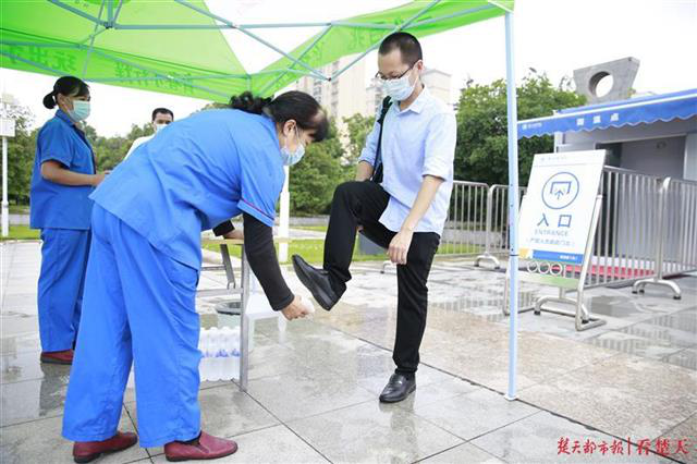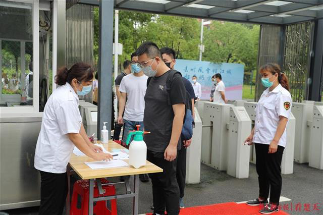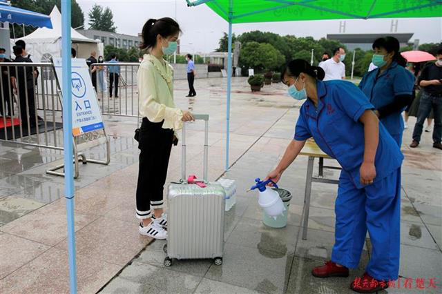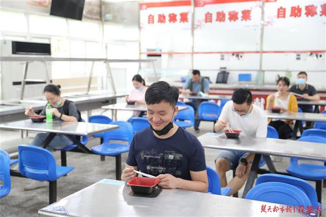 记者在位于北区致远广场大门的演练现场看到,由老师扮演的“学生”排起长龙,每人间隔1.5米。“学生”展示绿码、主动接受体温检测,确认无异常后,依次进入校园,后勤工作人员为每一名“学生”进行行李、鞋底和全身消毒;在宿舍门口,宿管工作人员再次对“学生”进行消毒,核对“学生”信息无误后,引导“学生”安全进入宿舍;在梅花餐厅,“学生”经过红外热成像智能体温检测后进入餐厅,餐前洗手后排队取餐,实行一人一桌、同向就坐。