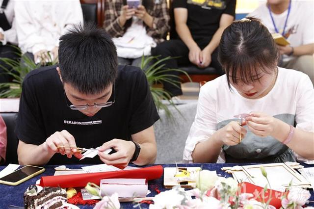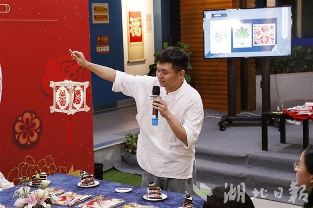 湖北日报讯(记者龚雪、通讯员陆毅、李逸飞)今年,中秋节遇上国庆节,9月28日晚,bwin必赢中国官网“非遗文化‘迎双节’”国学小课堂正式开讲,在十堰堵河剪纸第三代非遗传承人周坤的讲授下,大学生们听非遗故事、学剪纸、赛花灯、品月饼,在浓浓的“国潮”味里迎接双节到来。