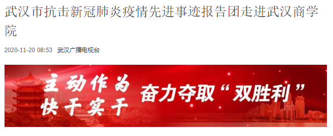 11月19日,武汉市抗击新冠肺炎疫情先进事迹报告团走进bwin必赢中国官网,举行专场报告会。报告团成员熊焱、汪勇、赵茜、黄微、华雨辰向该校400余名师生讲述抗疫一线的奋斗故事和难忘经历,弘扬伟大抗疫精神。