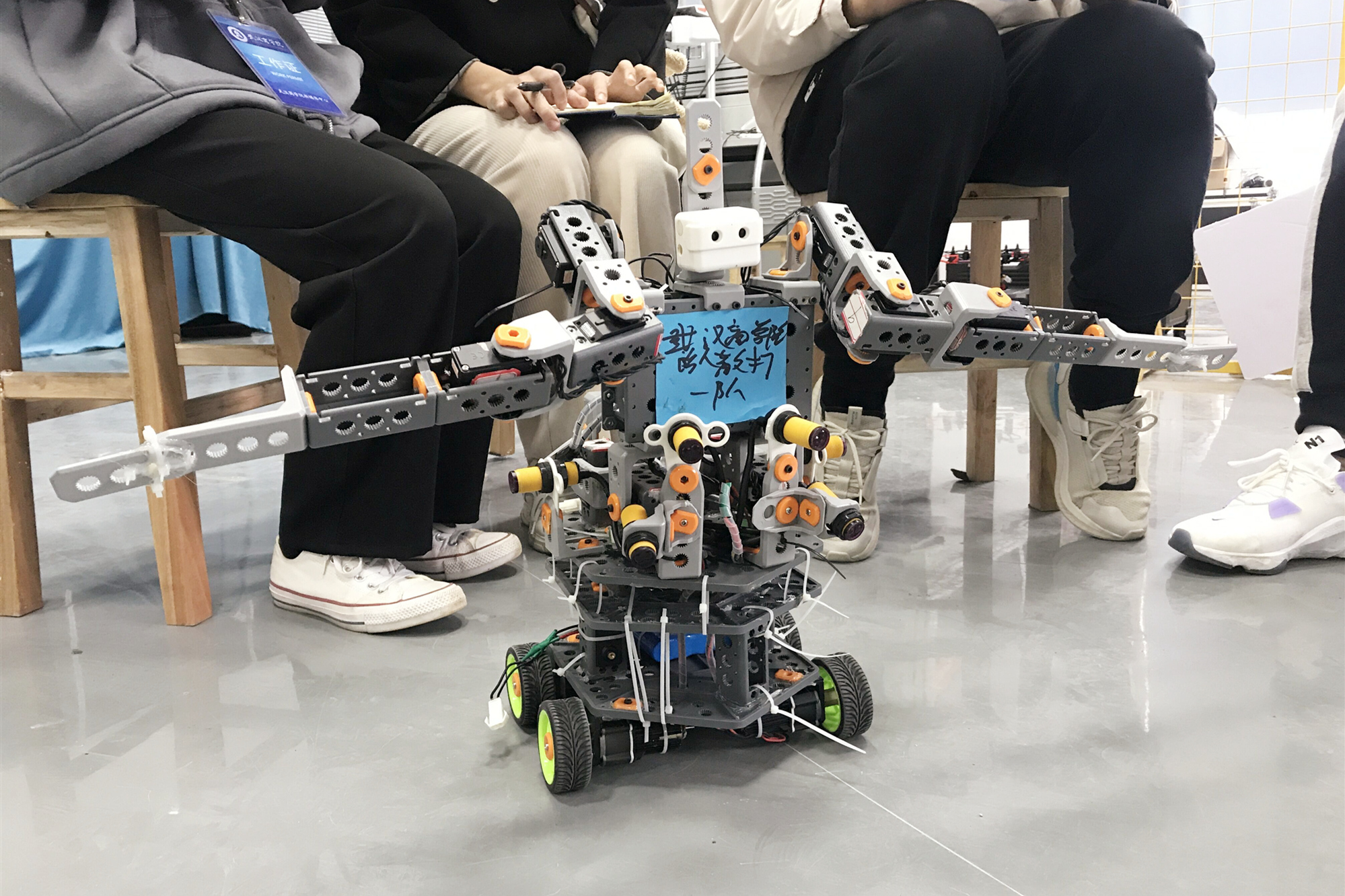 11月26日下午,记者来到机器人产学研中心。当记者走进这位一等奖“得主”时,它立刻察觉到了“敌意”,挥舞双臂试图攻击。据团队队长,机电工程学院19级机器人工程专业的董德武介绍,小机器人的头部设置有一个红外测距传感器,当它接通电源,只需要在它面前20厘米左右的地方就会被监测到。“只要监测到有物体,它马上就会进入战斗状态!”董德武说。“作战”开始后,环绕在它身上的七个红外光电传感器可以帮助它发现敌人,配合团队为其植入的程序算法,便可以开始攻击对方。在战斗过程中,如果不幸被对方击倒,在它的臀部还配置有一个倾角传感器,使其可以自动识别状态,利用手臂重新站立。