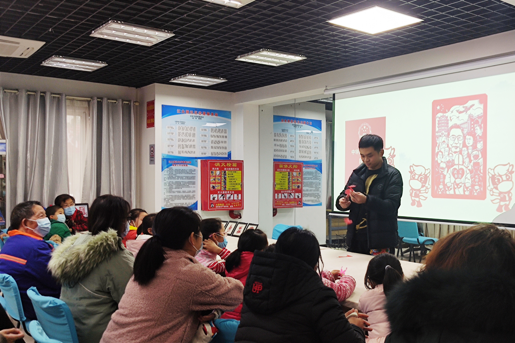 宣讲结束,党员教师们现场邀请20名老人和孩子体验剪纸艺术的乐趣。周坤现场教学,社区居民们手持剪刀和红纸,依次剪出医生、口罩、花草等剪纸作品,将对家乡城市的热爱,对美好生活的向往、对新时代法治社会、法治国家的期望注入剪纸作品中。