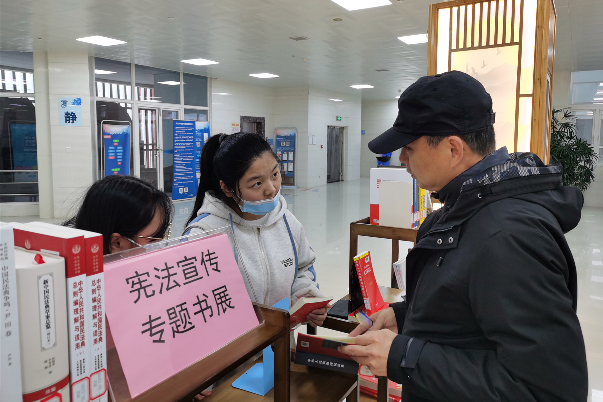 本网讯 为在读者中开展深入学习习近平法治思想,大力弘扬宪法精神,维护宪法权威,推动宪法全面实施,深入学习贯彻党的十九大和十九届二中、三中、四中、五中全会精神。图书馆党支部于12月1日开始,在图书馆二楼入馆大厅“致远书苑”,面向读者展览推送《中华人民共和国宪法》《中华人民共和国民法典》以及国家安全、防恐、消防、保密、宗教、档案、生态环境保护等相关法律法规的图书活动。活动得到了读者积极响应,读者们纷纷拿起书籍翻阅借读,此次活动在读者中营造着遵法学法守法用法的浓厚学习氛围。