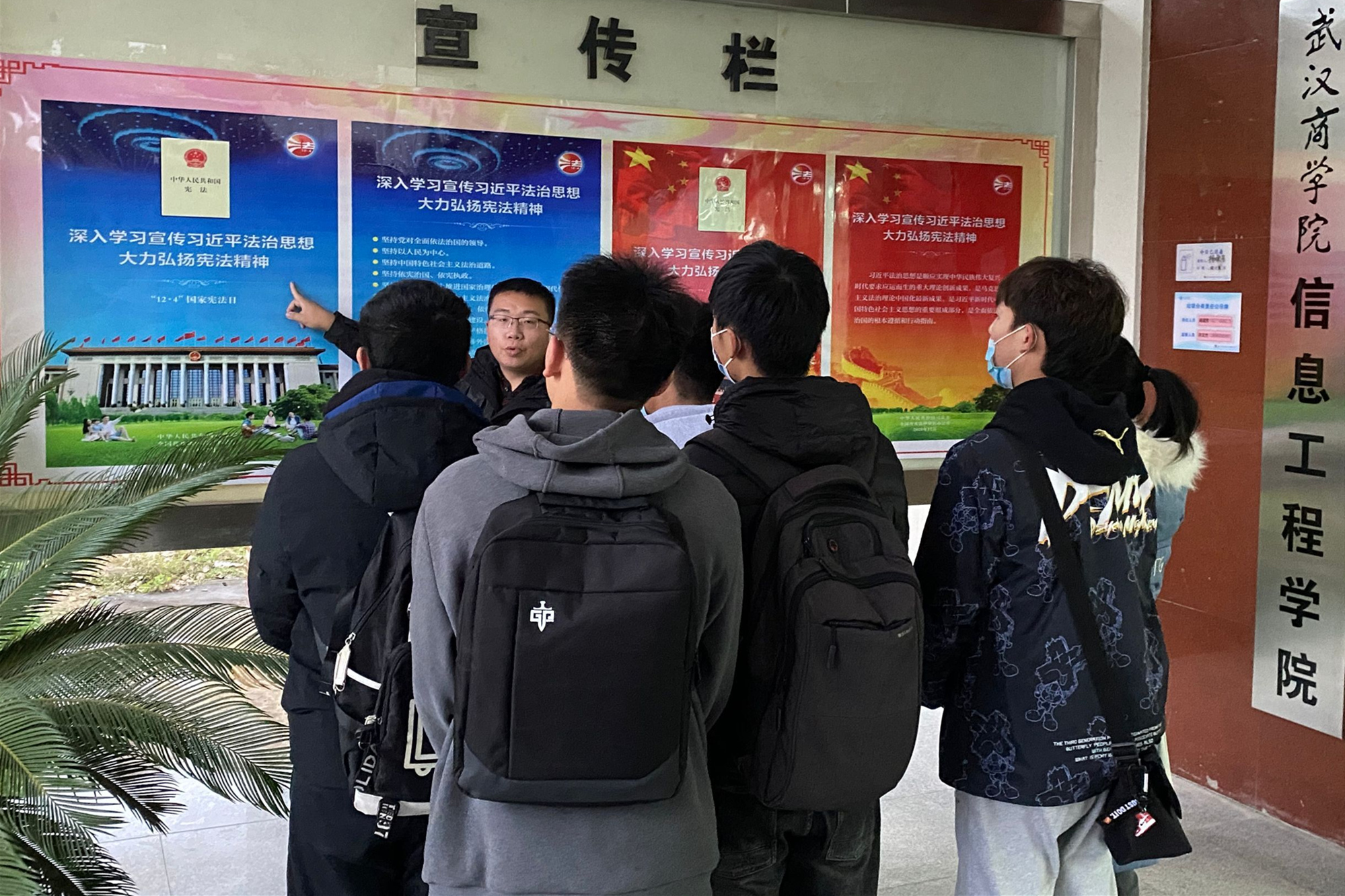 本次宪法宣传日活动由信息工程学院的万慧、刘桢两位法学专业毕业的辅导员老师组织学生学习宪法知识,宣传民法典等重要的法律法规,让每一名同学都能在12月4日这一天感受到国家宪法的权威和法律的重要。
