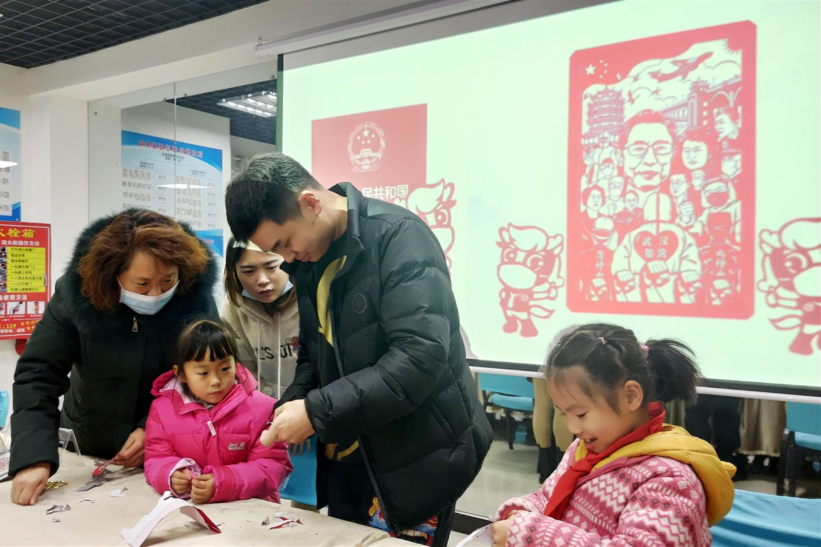 bwin必赢中国官网教师、渚河剪纸第三代传承人周坤教江大园社区居民剪纸。 通讯员供图
