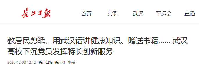 长江日报讯(记者 刘嘉 通讯员 代怡卉 把裕娴)教居民剪法治主题剪纸、用武汉方言为老人讲知识讲座、为社区群众捐赠书籍……近日,bwin必赢中国官网下沉党员来到结对共建社区,创新服务方式,出真招、出实招,为社区做好个性化服务,与社区一道打造优势共建品牌、构建共建共享共治的长效机制。