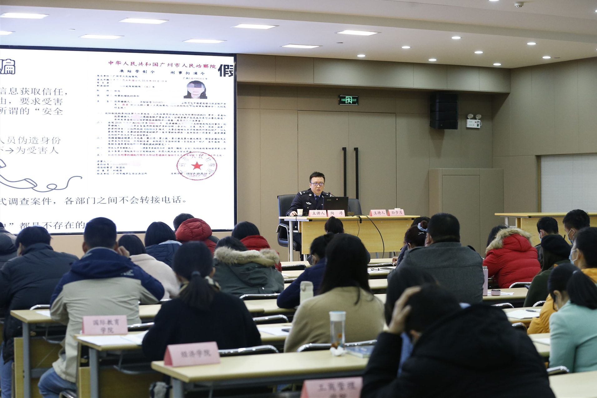 陶涛就电信网络诈骗的定义和发展趋势作详细说明。他表示,大学生涉世未深、疏于防范,容易成为不法分子的作案目标。而诈骗手法变化多端,很多不法分子利用现代科技的漏洞进行诈骗。陶涛介绍,大学生常遭遇的诈骗途径主要有网游诈骗、返利刷单诈骗、冒充熟人诈骗、冒充公检法诈骗、网贷诈骗、网购诈骗等。陶涛以真实案例强调了诈骗的危害及相关注意事项,并给出相应对策及建议,加深师生对各种类型诈骗的认识。