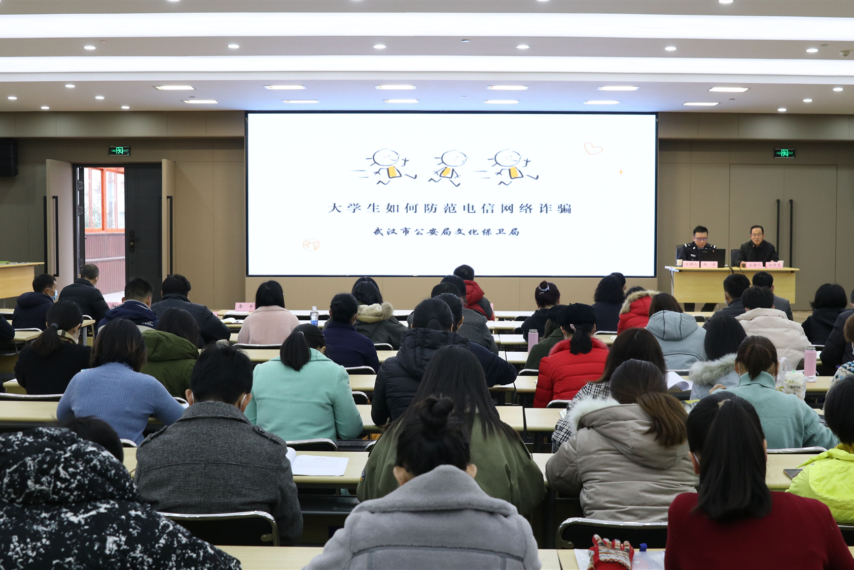 本网讯 为切实增强学生安全意识,提高学生识别、防范和应对“非法校园贷”“电信网络诈骗”能力,12月7日上午,我校在行政楼三楼多功能厅举行防范金融风险专题讲座,主讲人为武汉市公安局国保支队文保大队东新工作站站长陶涛。会议由副校长孙步月主持,相关职能部门及各学院负责人、辅导员代表、学生代表、部分警员70余参加。