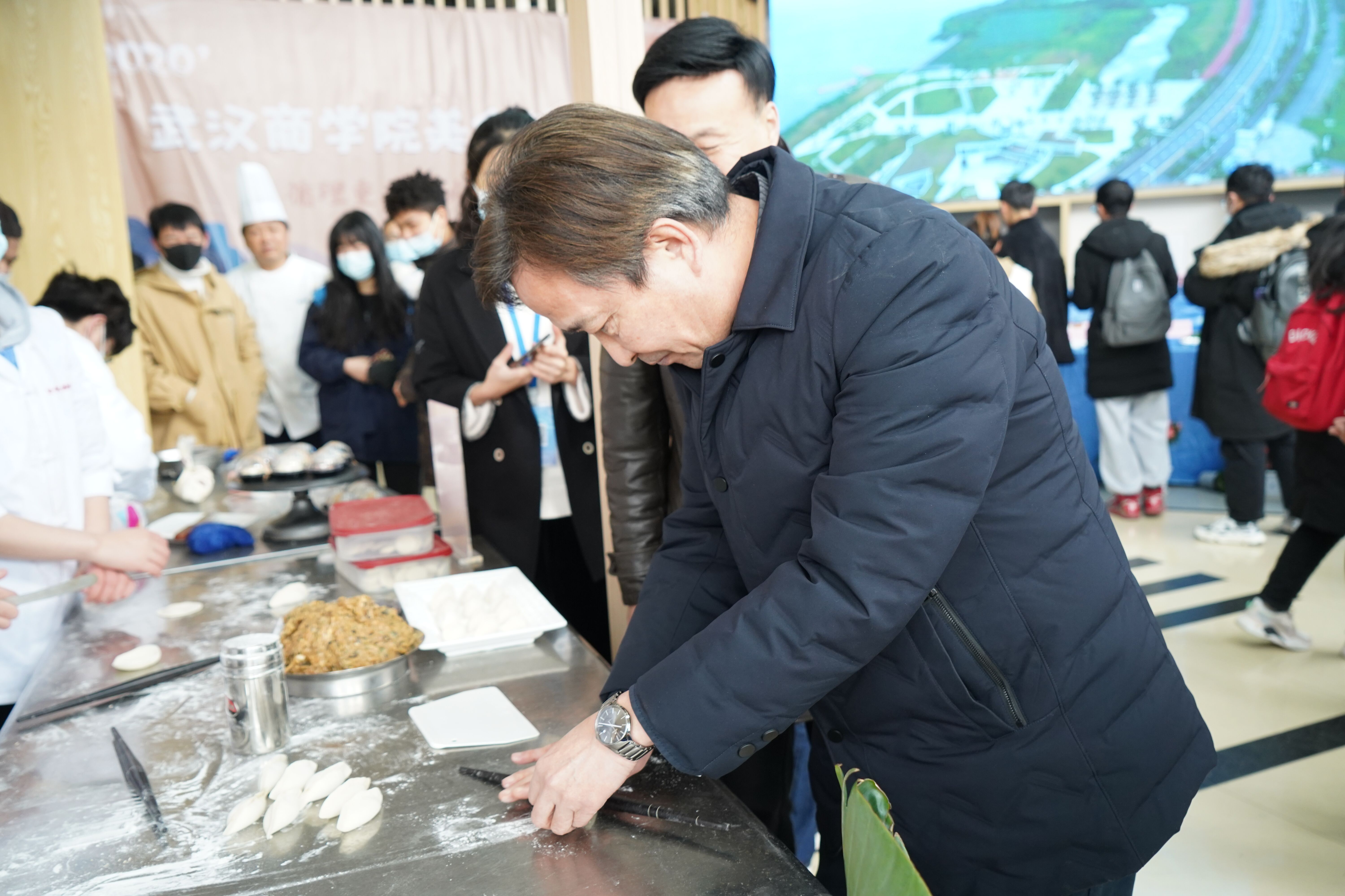 在技能展示区前,同学们认真围在制作饺子的展台前进行观看,很快一张厚薄相当的饺子皮在校长王清华手中擀制完成。“看,压一下再转一下,这样饺子皮就会中间鼓四边薄。这样在水煮时一方面能保持饺子完整性,另一方面还能更好煮出饺子的香味。”王清华一边制作,一边向大家进行解说。随后,王清华还对技能展示区的同学们进行了肯定:“大家做得很棒,希望大家在以后的学习中能够继续保持,体现bwin必赢中国官网学子的风采。”