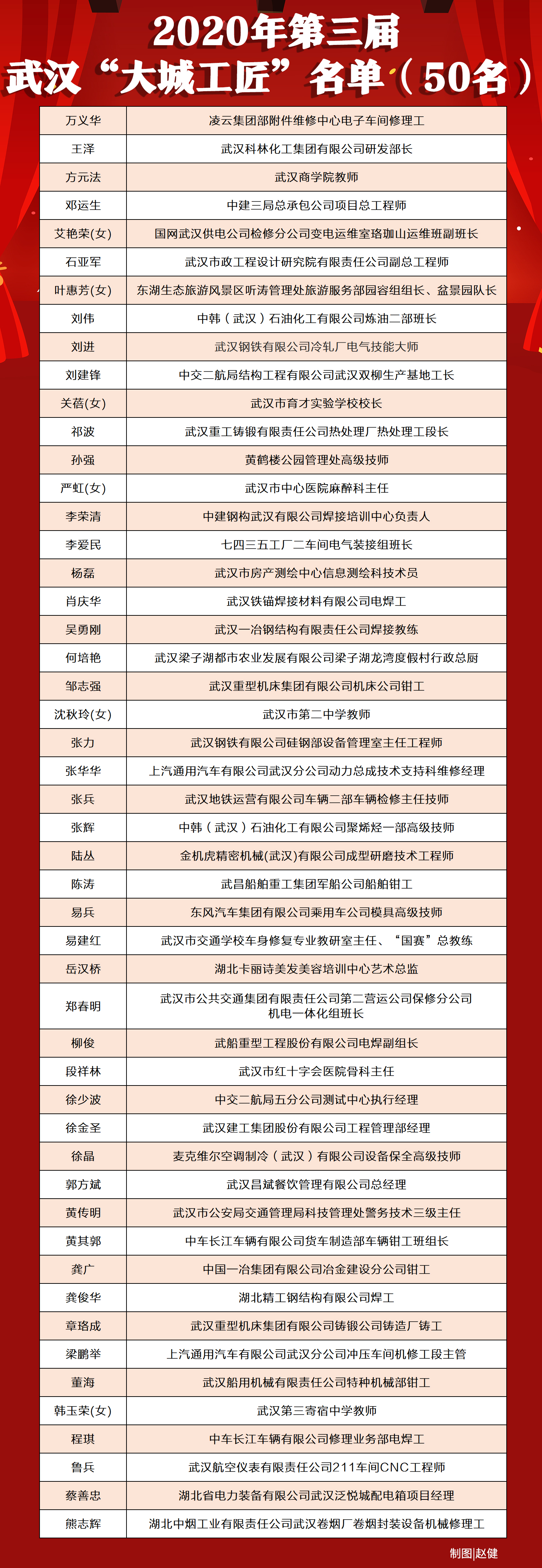 长江日报-长江网 12月31日讯 12月31日,2020年第三届武汉“大城工匠”结果揭晓,50名一线职工获“大城工匠”荣誉称号。