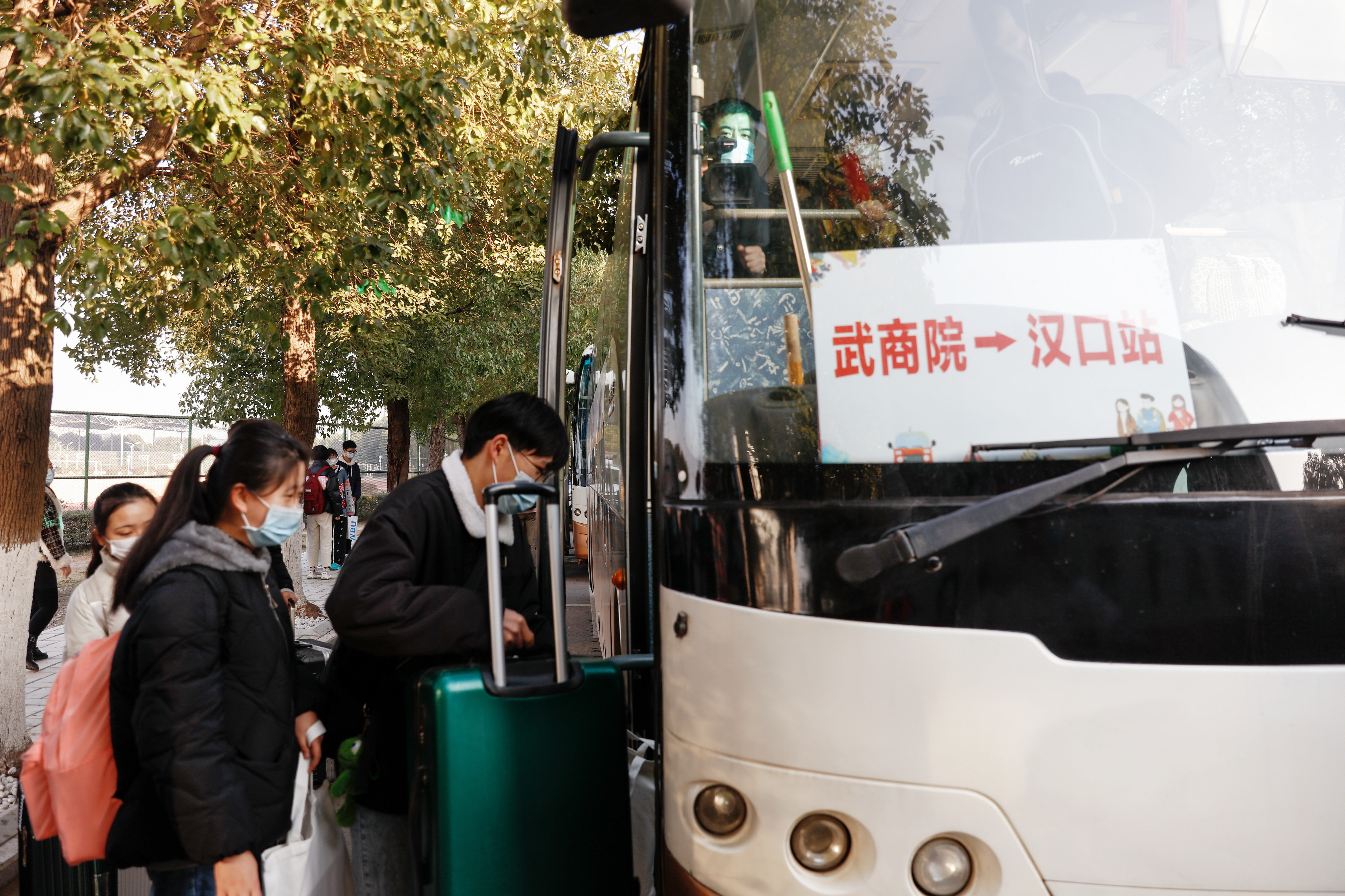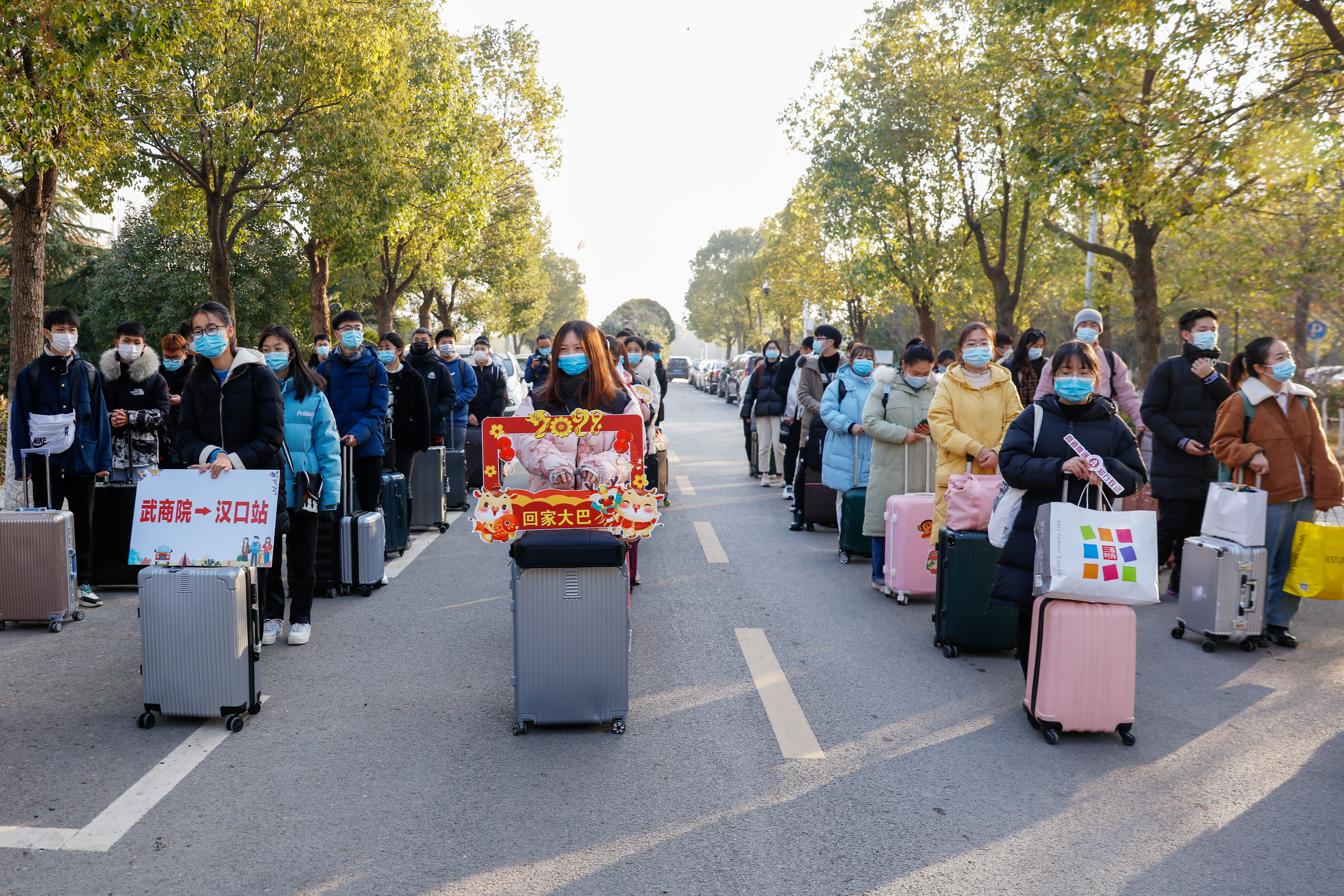 记者在现场看到,乘坐大巴的学生按照汉口站和武汉站分别间隔排队,从校长王清华、副校长张石手中领取暖心大礼包后依次登车。76名学生中,去往武汉站的9人,去往汉口站67人。“乘坐学校的大巴可以避免路上转乘多趟公共交通,很安全。”2019级经济学院学生张恒告诉记者,自己家住随州,以往回家,需要坐有轨电车,再换乘地铁,差不多要两个小时,转乘的时间比花在高铁上的时间都多。“得知学校开通回家大巴,我立马就报名了,还相约了几个同乡同学,大家互相照顾,安全回家!”张恒说。2020级学生马建波第一次乘坐回家大巴,打开暖心大礼包后,马建波很激动:“这样的礼包真暖心!”记者看到,暖心大礼包里放置了口罩、消毒棉片和医用手套等防疫物资,还为学生送上了《习近平与大学生朋友们》《历史从未走远》等书籍以及保温杯、春联、定制台历、U盘、暖手宝等物品。家住山东的刘华轩回家需要7个小时:“学校的大巴真是开到人心里了,父母也很放心。我打算在路途上把这本《习近平与大学生朋友们》读完,这样的旅途更有收获。”