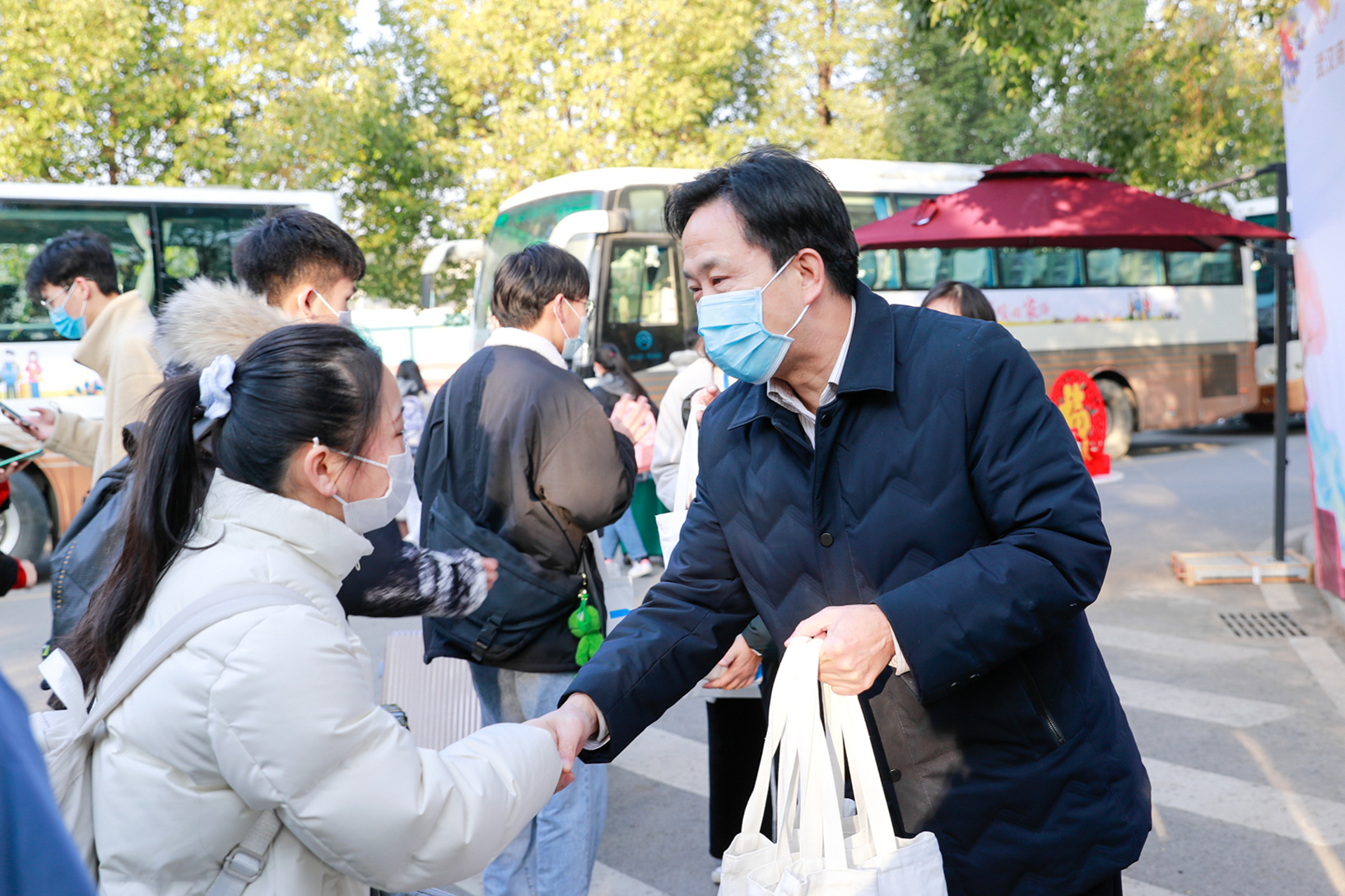 出于疫情防控的考虑,我校这一次的回家大巴有了新变化,除了为学生送防疫物品外,学生乘坐的大巴也进行了全面消毒,并进行错位乘坐,确保学生安全。临行前,送行的辅导员帮学生将行李箱放到行李舱内,校长王清华特地上车一再叮嘱学生务必全程佩戴口罩,做好个人防护。“如果途中有遇到问题,大家第一时间联系辅导员、联系学校,学校永远是你们最坚强的后盾!”王清华说。